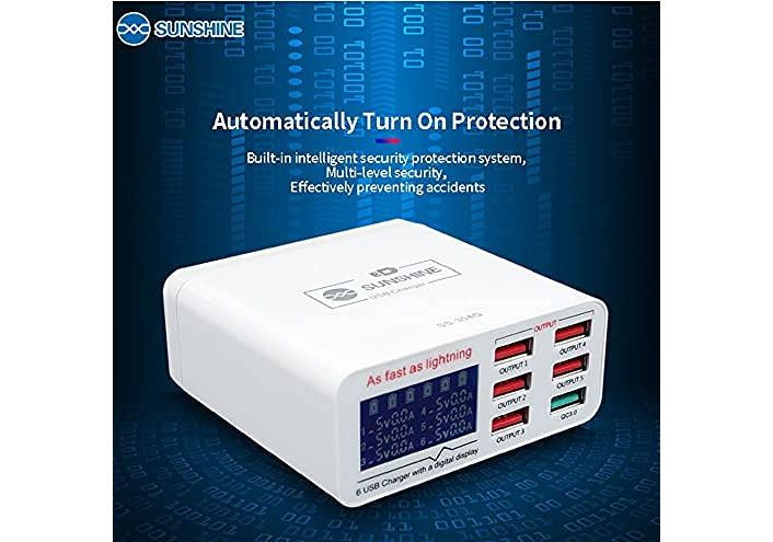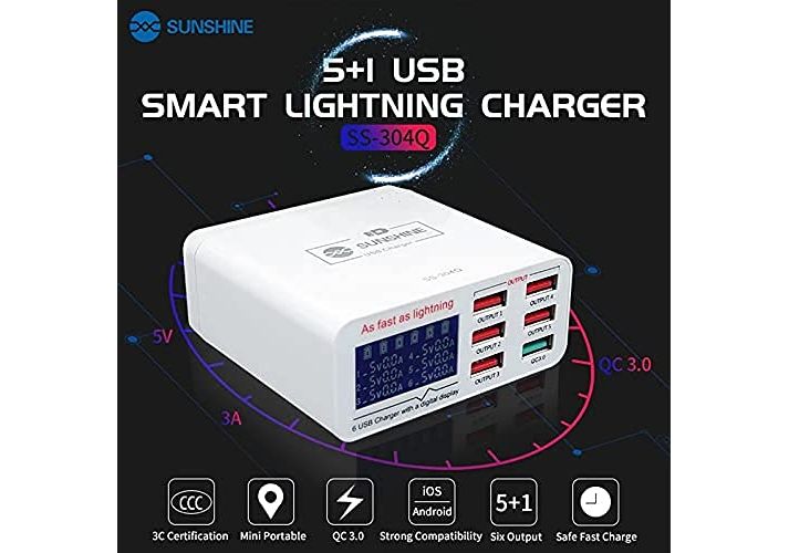 - تستر شارژ سانشاین SS-304Q دارای 6 عدد پورت خروجی USB میباشد که 3 عدد از انها فست شارژ نیز میباشد.