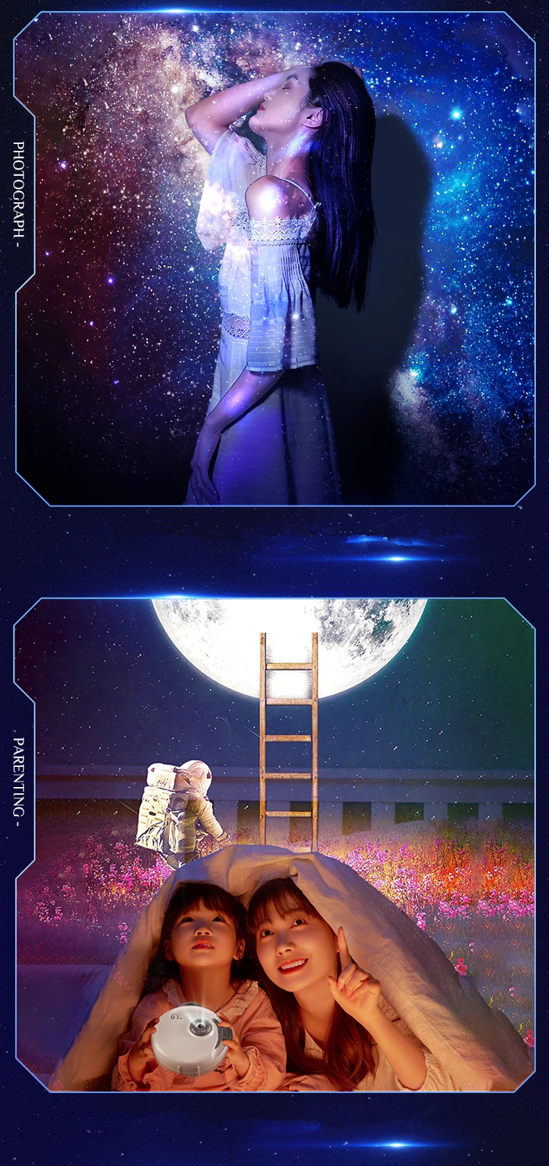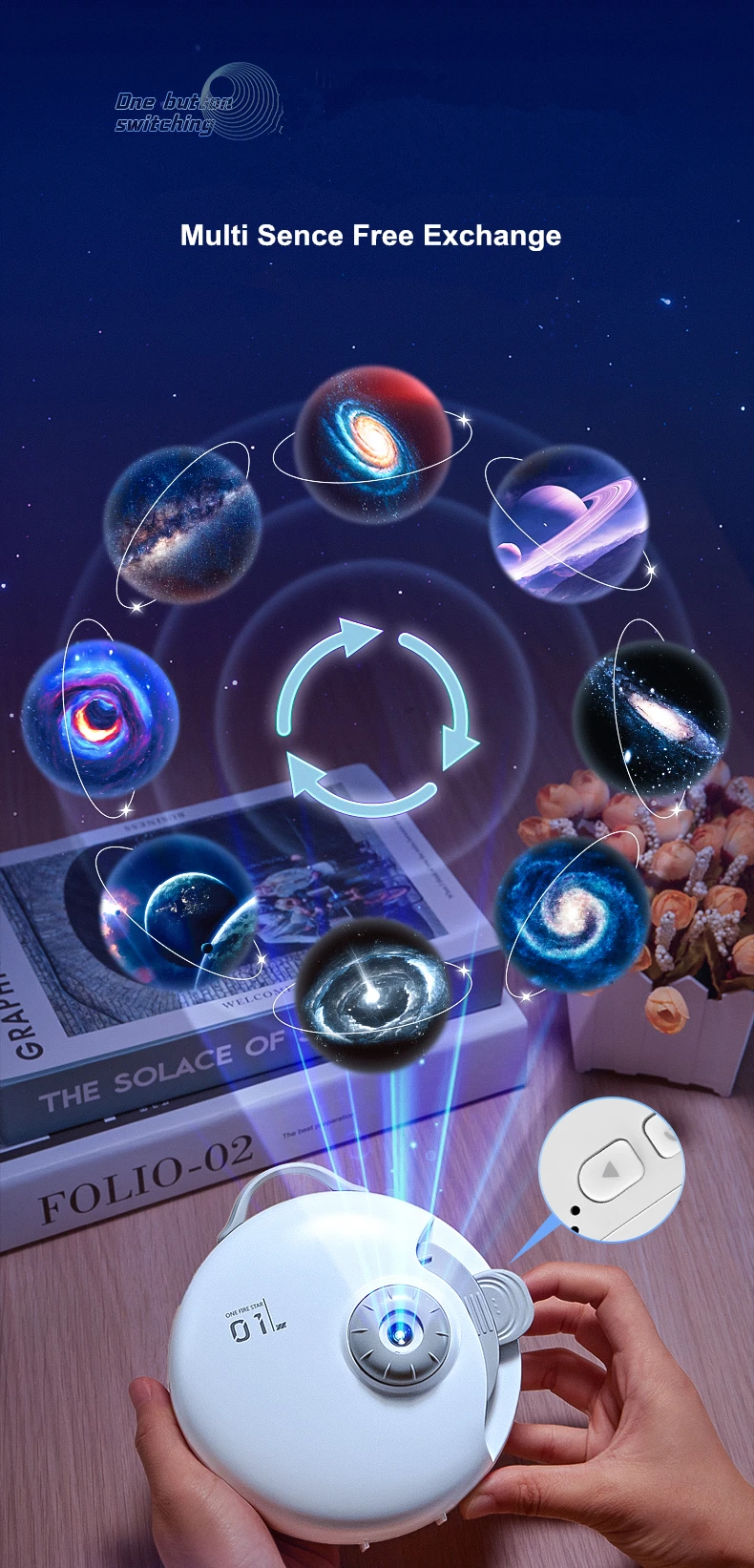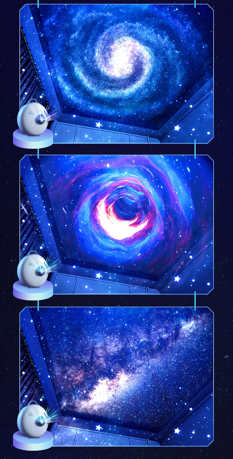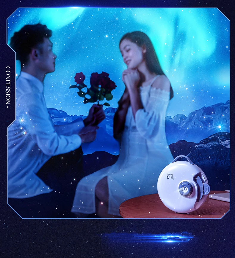 - نور کهکشانی HD قابل فوکوس: نمایش نورهای متحرک و رنگی روی سقف یا دیوار با وضوح بالا.