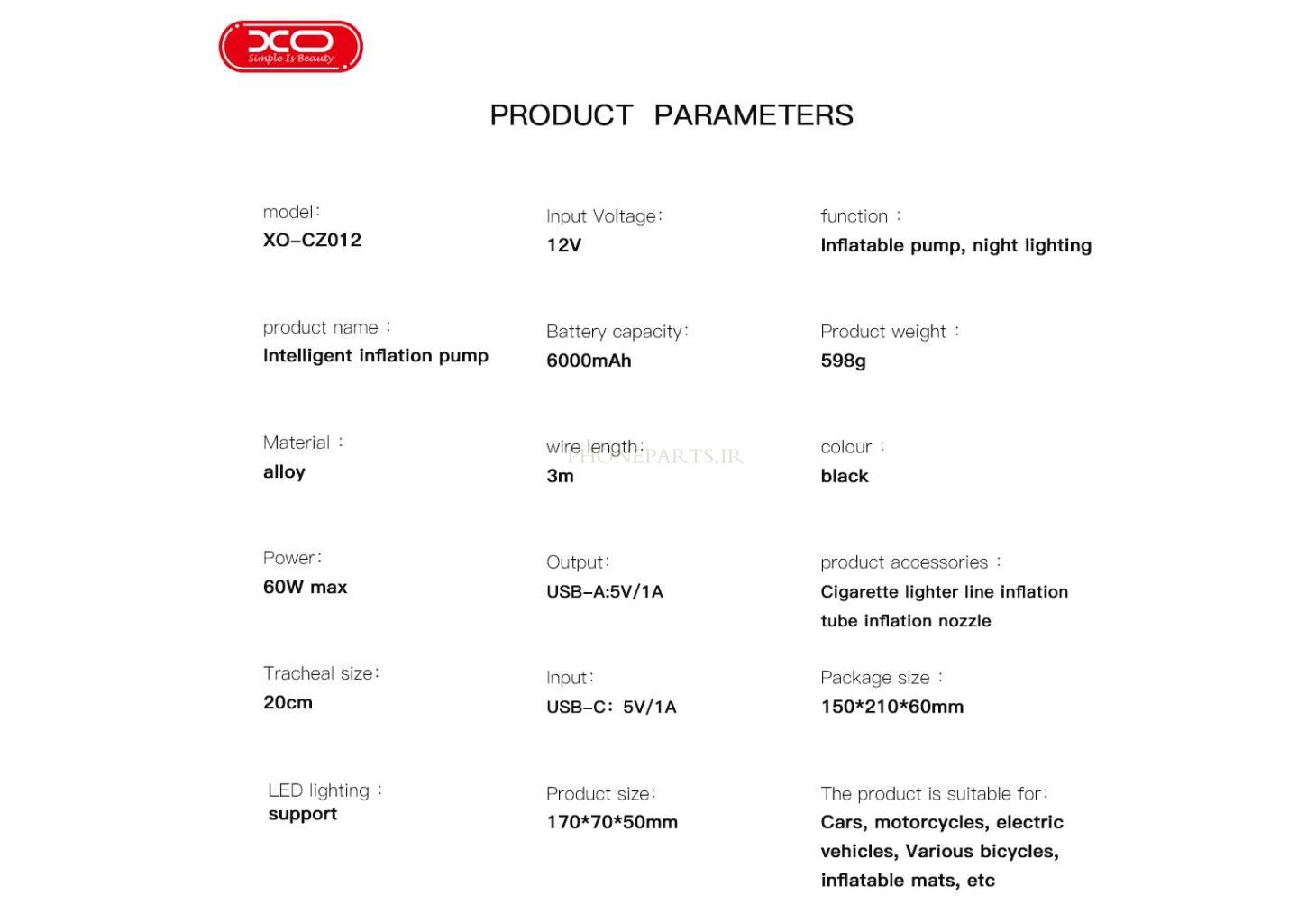 در کل ، پمپ باد چند منظوره هوشمند INFLATOR PUMP XO-CZ012 یک وسیله کارآمد و قابل حمل است که به شما کمک می کند در بادکشی و تنظیم فشار مختلفی که در زندگی روزمره و ورزش ها نیاز دارید ، به سرعت و به صورت دقیق عمل کنید . پشتیبانی از انرژی: INFLATOR PUMP XO-CZ012 دارای گزینه های پشتیبانی از انرژی متنوعی است . این دستگاه معمولاً با منبع تغذیه 12 ولتی از اتومبیل شما کار می کند ، اما همچنین دارای باتری داخلی یا پورت USB برای شارژ و استفاده به صورت مستقل می باشد .