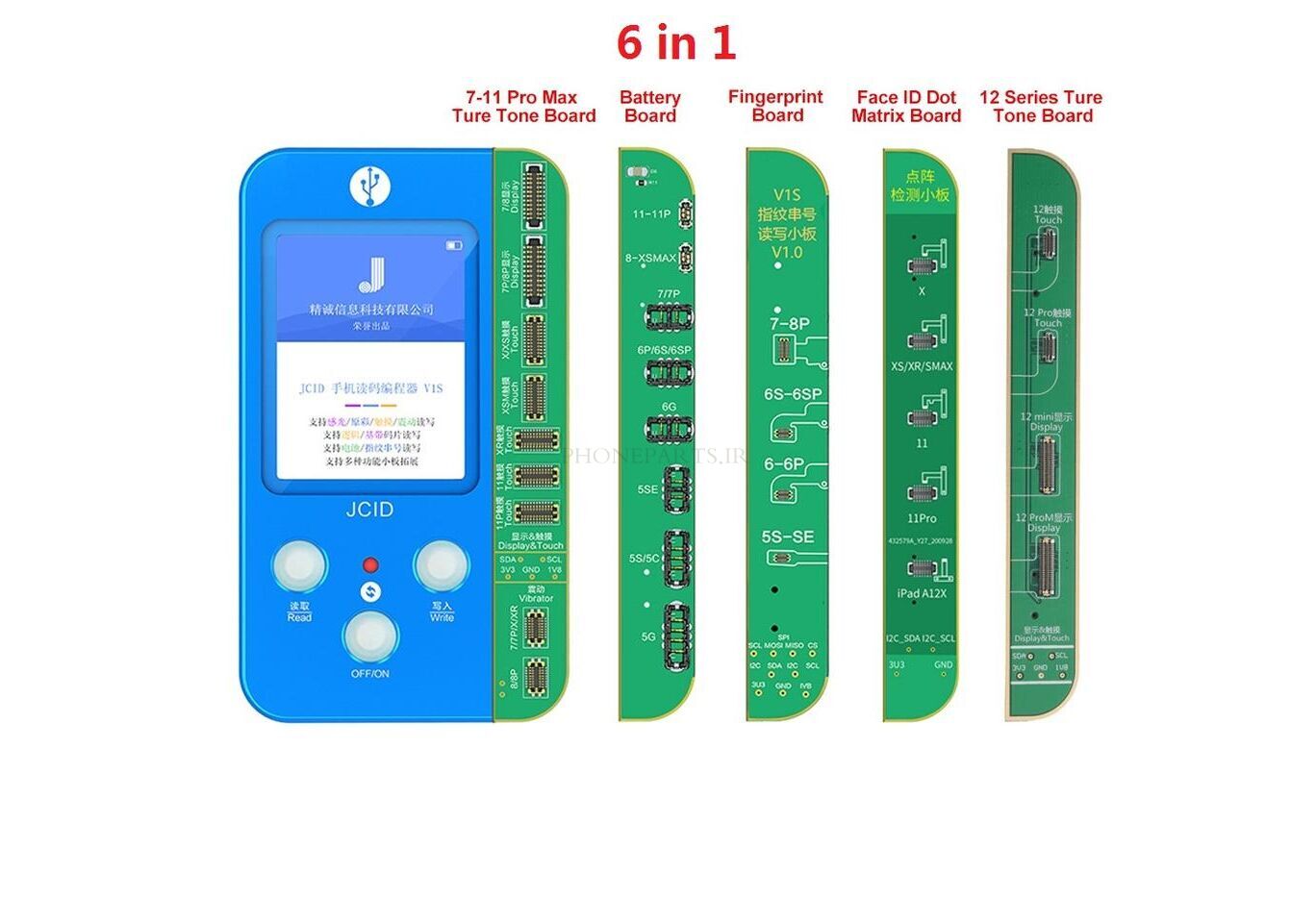 پروگرامر JC V1S شش ماژول – این محصول از 6 آداپتور جداگانه تشکیل شده است و هرکدام مناسب پروگرام کردن گوشی های آیفون از سری 5 تا 12 پرومکس میباشد.
