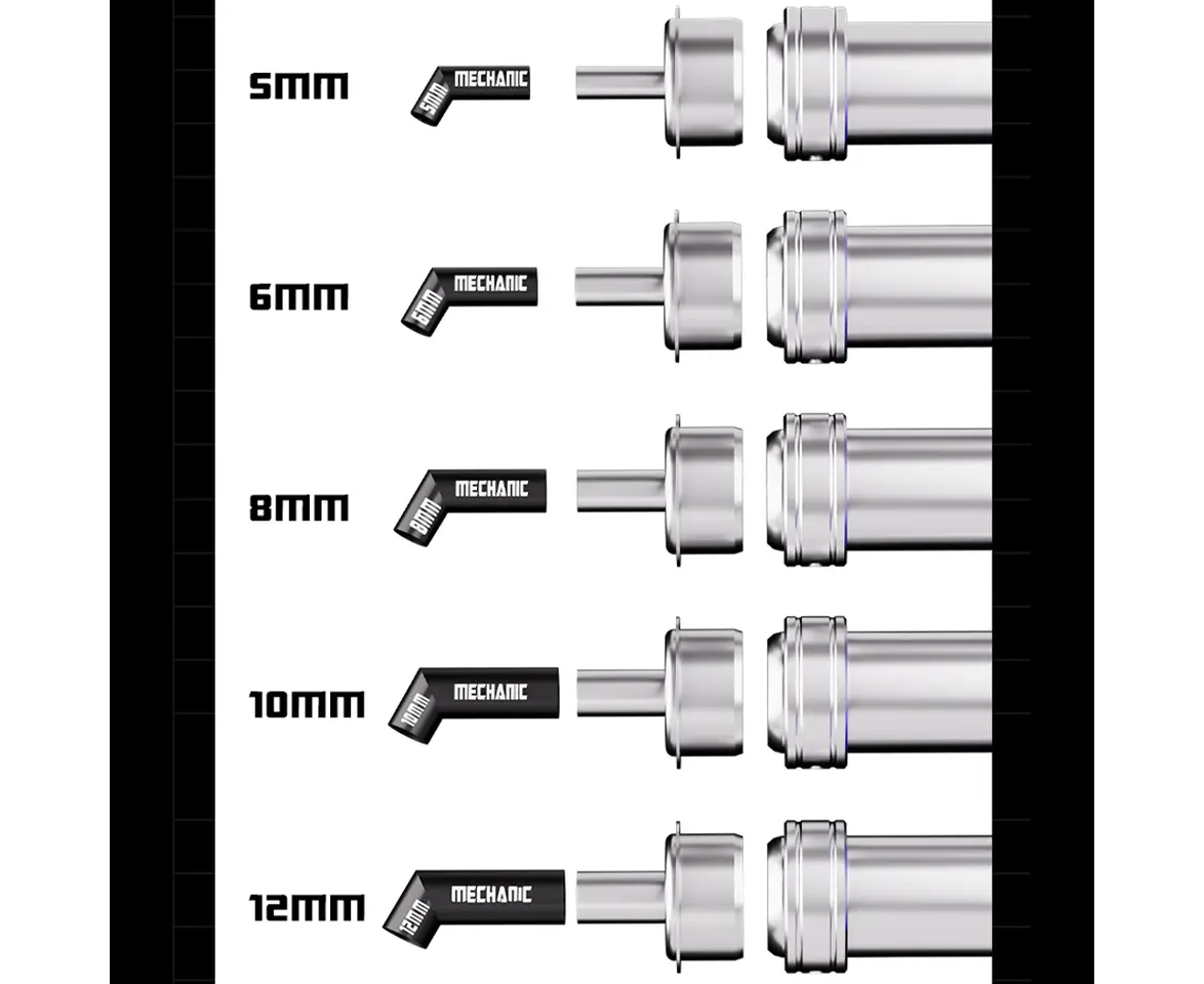 • اندازه‌های متنوع: شامل 5 نازل با قطرهای 5 میلی‌متر، 6 میلی‌متر، 8 میلی‌متر، 10 میلی‌متر و 12 میلی‌متر برای پاسخگویی به نیازهای مختلف تعمیراتی.