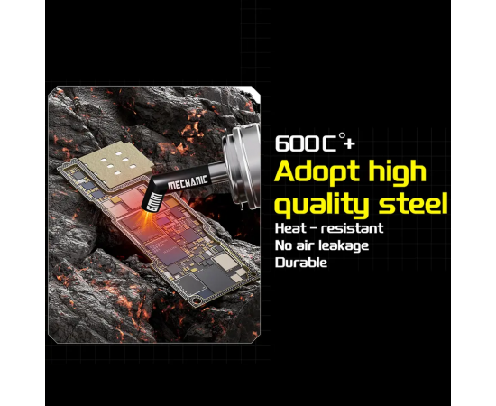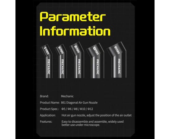 • نصب آسان: نازل‌ها به‌راحتی روی دستگاه‌های هیتگان (Hot Air Gun) سری مکانیک 861 نصب می‌شوند و اتصالی محکم و بدون نشتی دارند.
