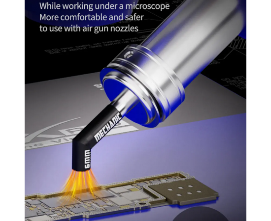 • دقت بالا در تعمیرات: طراحی مورب نازل‌ها امکان استفاده آسان در کنار میکروسکوپ را فراهم می‌کند و برای تعمیرات ظریف مانند مادربرد گوشی‌های موبایل ایده‌آل است.