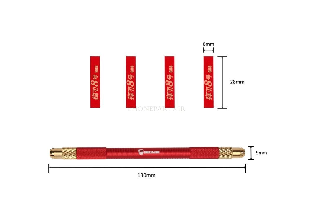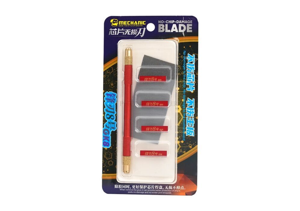 ست تیغ مکانیک GK8 – این ست یک محصول برای حذف چسب از آی سیها است که به دلیل طراحی خاص و مناسب هنگام جداسازی چسب مانع از آسیب رسیدن به آی سی میشود، ست تیغ MECHANIC GK8 از ورق مسی الاستیک پیشرونده بسیار نازک هشت لایه ساخته شده و به دلیل ساختار چند کامپوزیت از کیفیت بسیار بالا و مقاومت مناسبی برخوردار است، شما میتوانید با استفاده از این ست تیغ قطعه تراشه مادربرد را بدون رسیدن کوچکترین آسیبی به جزئیات آن تعمیر کنید.