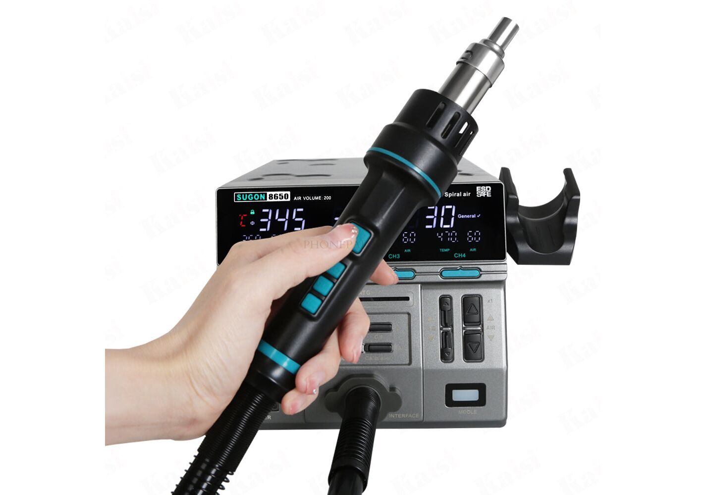 هیتر دیجیتال SUGON 8650 یکی از پیشرفتهترین مدلهای موجود در بازار است که با طراحی مدرن، عملکرد دقیق و قابلیتهای حرفهای، نیازهای تعمیرکاران تخصصی را بهطور کامل برآورده میسازد. این دستگاه با توان بالا و کنترل هوشمند دما، مناسب برای لحیمکاری، تعویض قطعات SMD و تعمیر بردهای حساس میباشد.