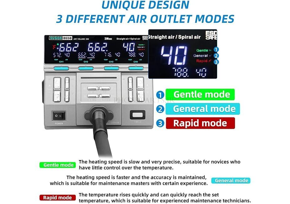 - حالتهای گرمایش: General، Gentle، Rapid برای تنظیم سرعت و شدت گرمایش متناسب با نوع قطعه