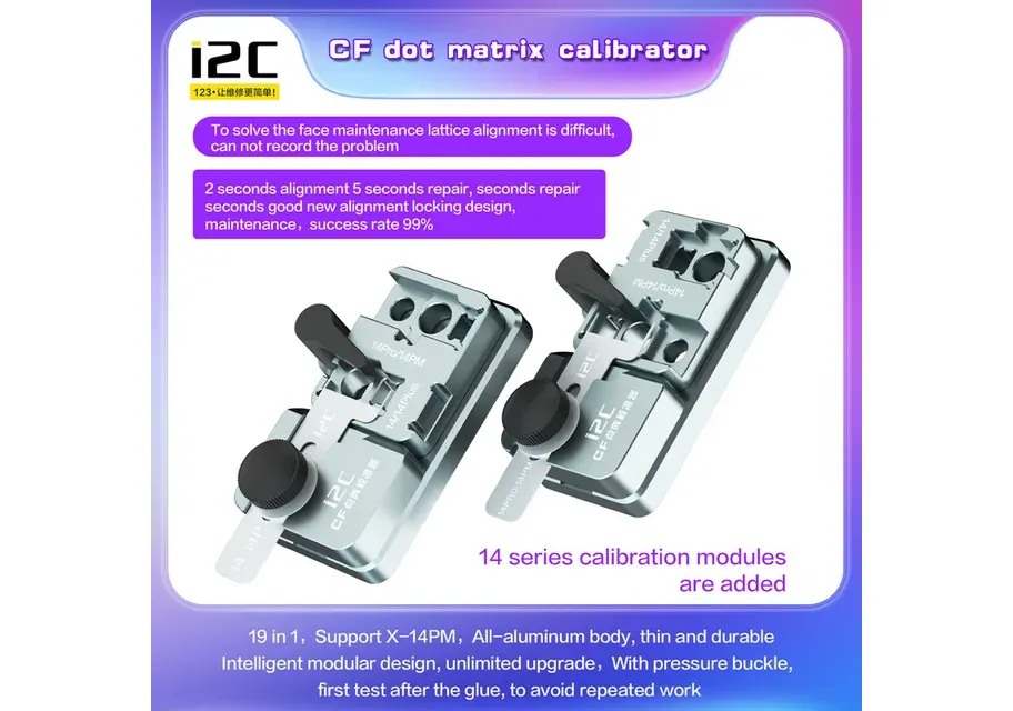 ابزار تعمیر آیفون به نام “i2C 19-in-1 Precision CF Dot Matrix Calibrator” یک ابزار برای تعمیر دوربینهای جلویی (یا به عبارت دقیقتر، پروژکتورهای نقطهای) آیفونها از مدل X تا 14 Pro Max طراحی شده است. اجازه دهید کمی بیشتر در مورد این ابزار برایتان توضیح دهم: