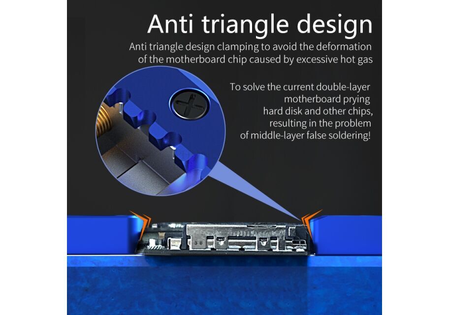 - طراحی ANTI-TRIANGLE برای جلوگیری از تغییر شکل و تاب برداشتن بردهای حساس ناشی از حرارت حین انجام کار