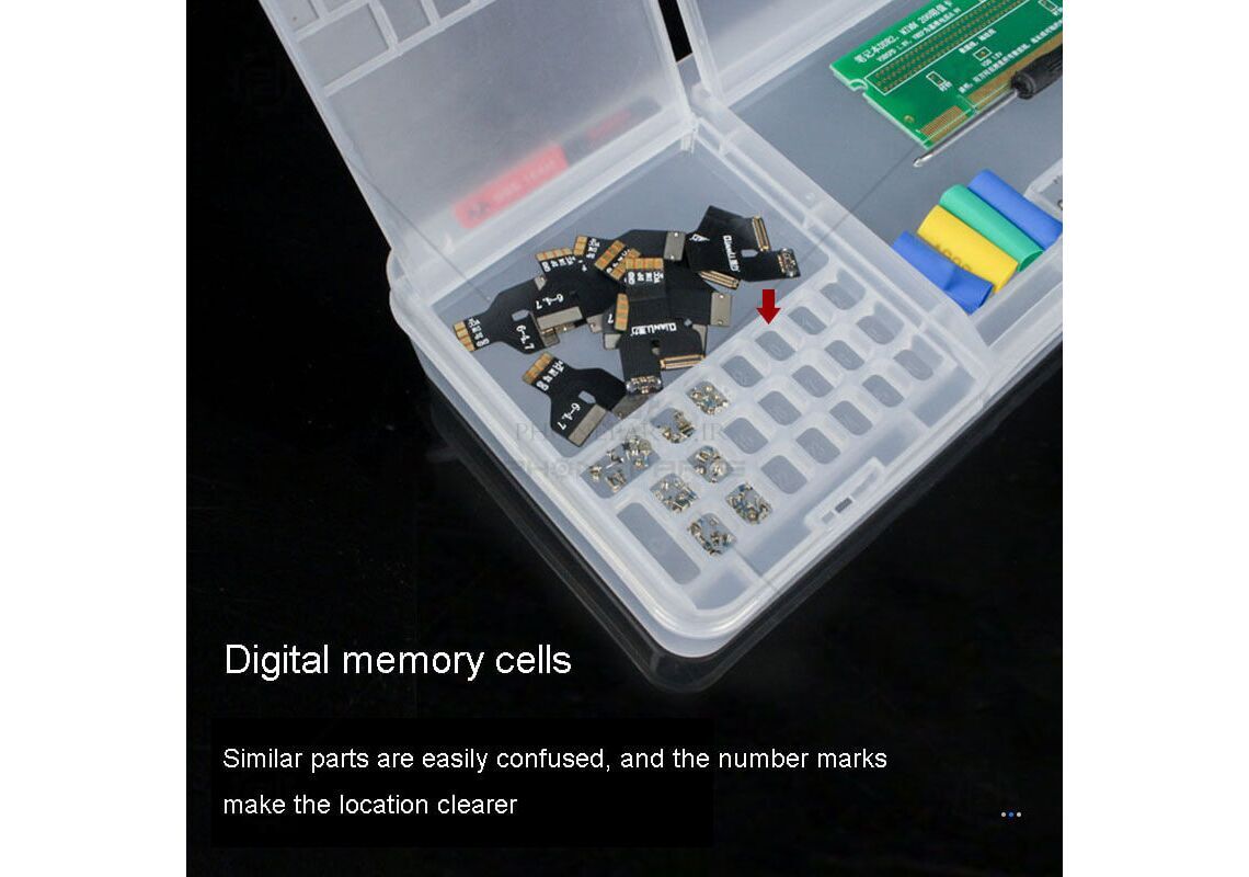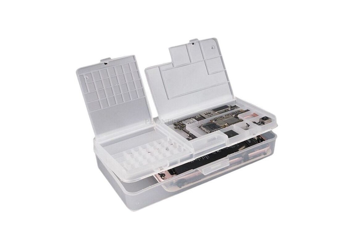 جعبه ذخیره سازی W203 یک ابزار بسیار کاربردی برای نگهداری و مدیریت قطعات مختلف موبایل،LCD، پردازنده، مادربرد، پیچها، تراشههای IC، و بسیاری از قطعات ریز در هنگام تعمیر میباشد.ممکن است که در هنگام تعمیر یک یا چند گوشی موبایل و قطعات حساس آن، نیاز به یک فضا برای جدا گذاشتن و نظم دادن به قطعات، برای جلوگیری از پراکندگی و یا تداخل با سایر گوشیهای تعمیری داشته باشید.جعبه ذخیره سازی چند کاره به شما کمک میکند بهراحتی و با اطمینان یک فضای مناسب برای قطعات حساس و مهم گوشیهای تعمیری داشته باشید.این جعبه ابزار از نظر حجم و وزن سبک بوده و فضای کمی را اشغال می کند. رنگ این جعبه ابزار شفاف بوده به طوری که محتویات داخل آن قابل مشاهده است.همچنین شما به راحتی میتوانید یک گوشه از میز کار خود را برای این جعبه ذخیره سازی اختصاص داده و با نظم و سازماندهی بهتر،از تعمیرات و نگهداری قطعات حساس اطمینان حاصل نمایید.