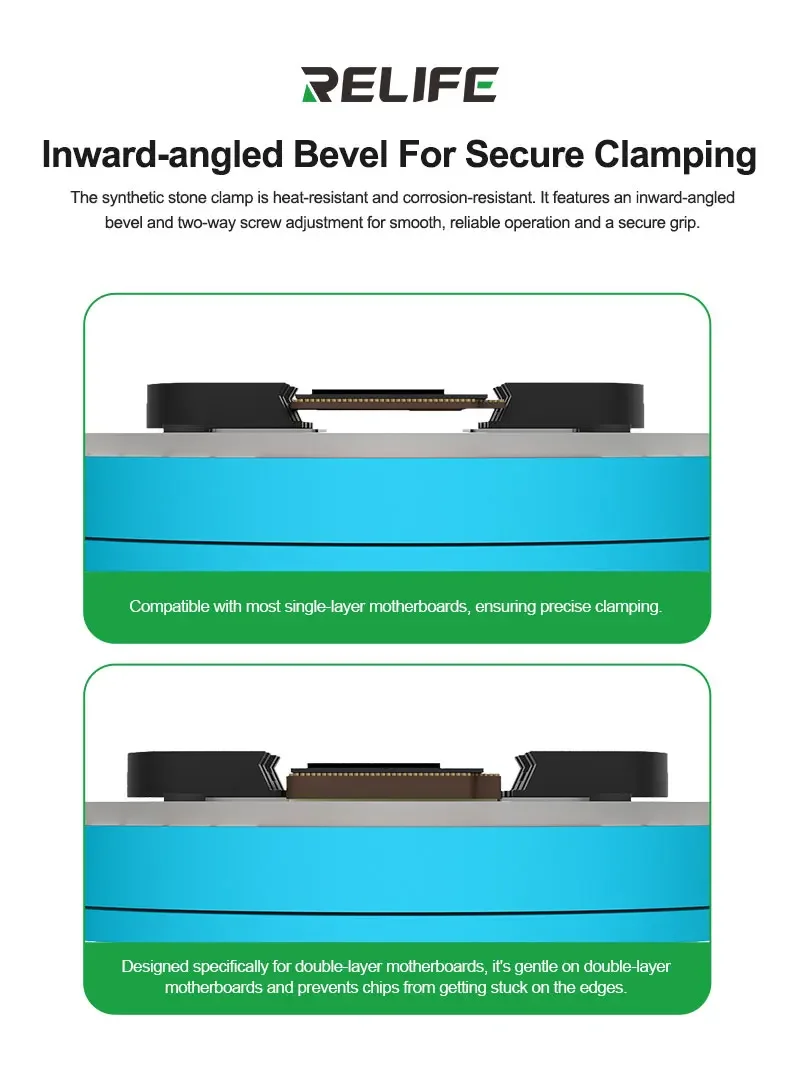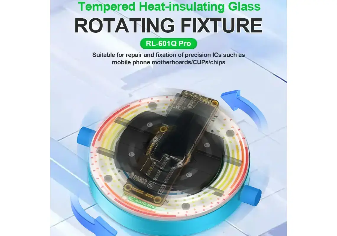 RL-601Q Pro یک فیکسچر دقیق با قابلیت چرخش 360 درجه و تنظیم زاویههای مختلف است. این ابزار بهطور خاص برای نگهداشتن و تثبیت ICهای حساس در طول فرآیند تعمیر، بازکاری و تثبیت طراحی شده است. چه در حال جداسازی CPU از مادربرد گوشی باشید یا بازکاری یک میکروچیپ، این فیکسچر تضمین میکند که قطعات شما در طول کار کاملاً ایمن و در موقعیت صحیح باقی بمانند.