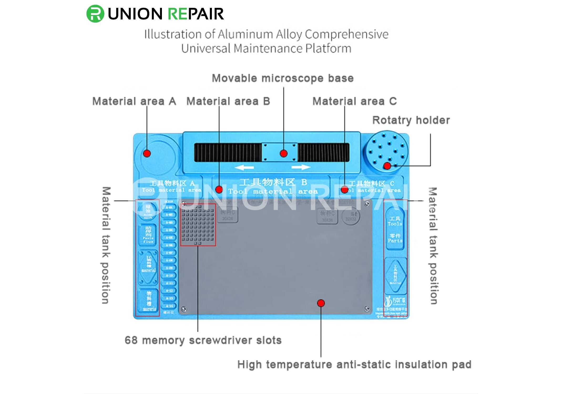پلت فرم تعمیر و نگهداری پد آلیاژ آلومینیوم پیشرفته چند منظوره برای تعمیر تلفن همراه، برای پلت فرم تعمیر و نگهداری تلفن همراه و میکروسکوپ پایه ثابت گیر می کند. این محصول می تواند تصاویر کاری تمیز و استاندارد شده را برای هر استاد تعمیر و نگهداری الکترونیکی ارتباطی و مشتری به ارمغان بیاورد، محیط کار تمیز و مرتب می شود و طراحی صفحه کار انسانی می شود.