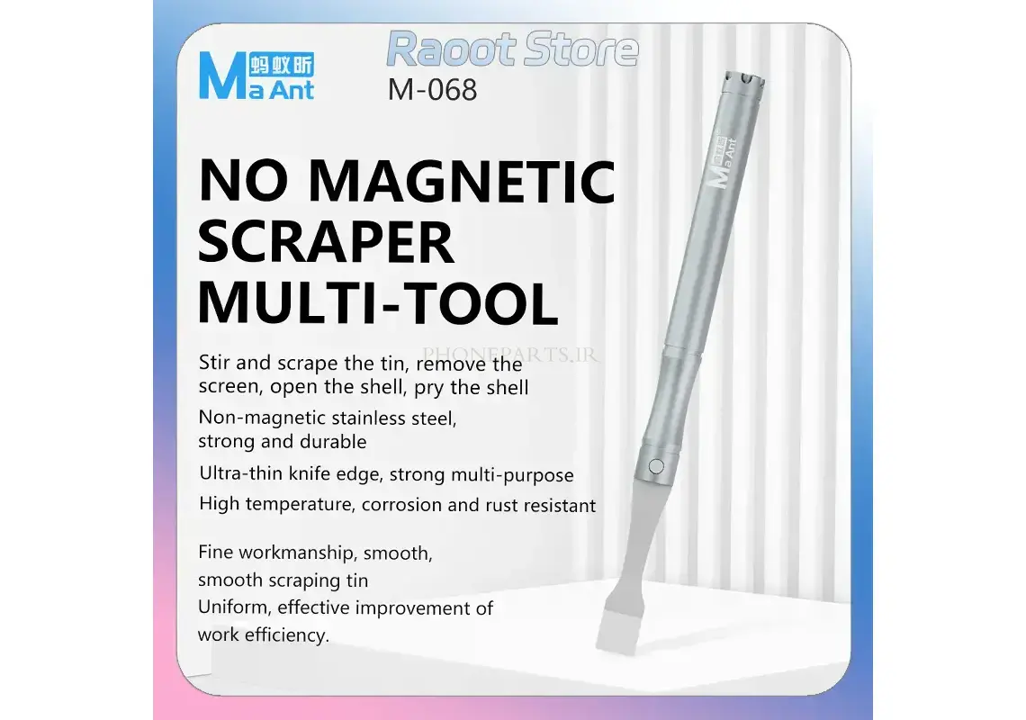 معرفی محصول:MaAnt M-068 یک ابزار چندمنظوره با کیفیت بالا است که برای تکنسینهای حرفهای تعمیرات الکترونیک، موبایل و تبلت طراحی شده است. این ابزار ترکیبی از یک چاقوی راشپیل (رندهکننده) اینقلع، میکسر پاستای لحیمکاری و اسپاجر (ابزار بازکننده) است که با استفاده از فلز با حافظه شکلی (Memory Metal) ساخته شده است. این ویژگیها، M-068 را به یک ابزار ضروری برای هر کارگاه تعمیرات تبدیل کرده است که دقت، دوام و کارایی را در کنار هم ارائه میدهد.