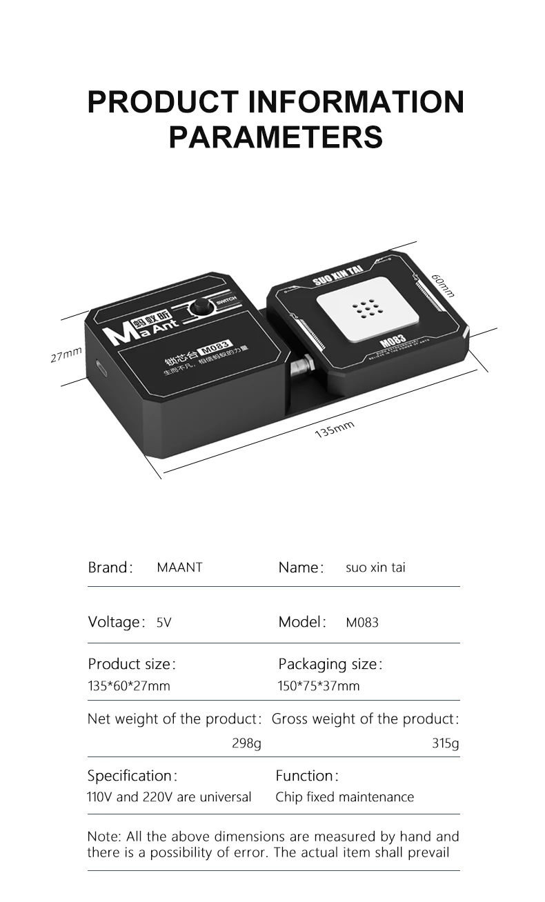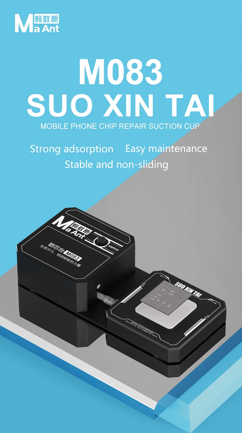 پلتفرم مکنده تعمیر چیپ MaAnt M083 یک ابزار حرفهای برای تثبیت چیپهای موبایل در فرآیند تعمیر، لحیمکاری و برداشتن قلع است. این محصول با طراحی مقاوم، مکش قوی و رابط Type-C، انتخابی مناسب برای تعمیرکاران موبایل و الکترونیک محسوب میشود.