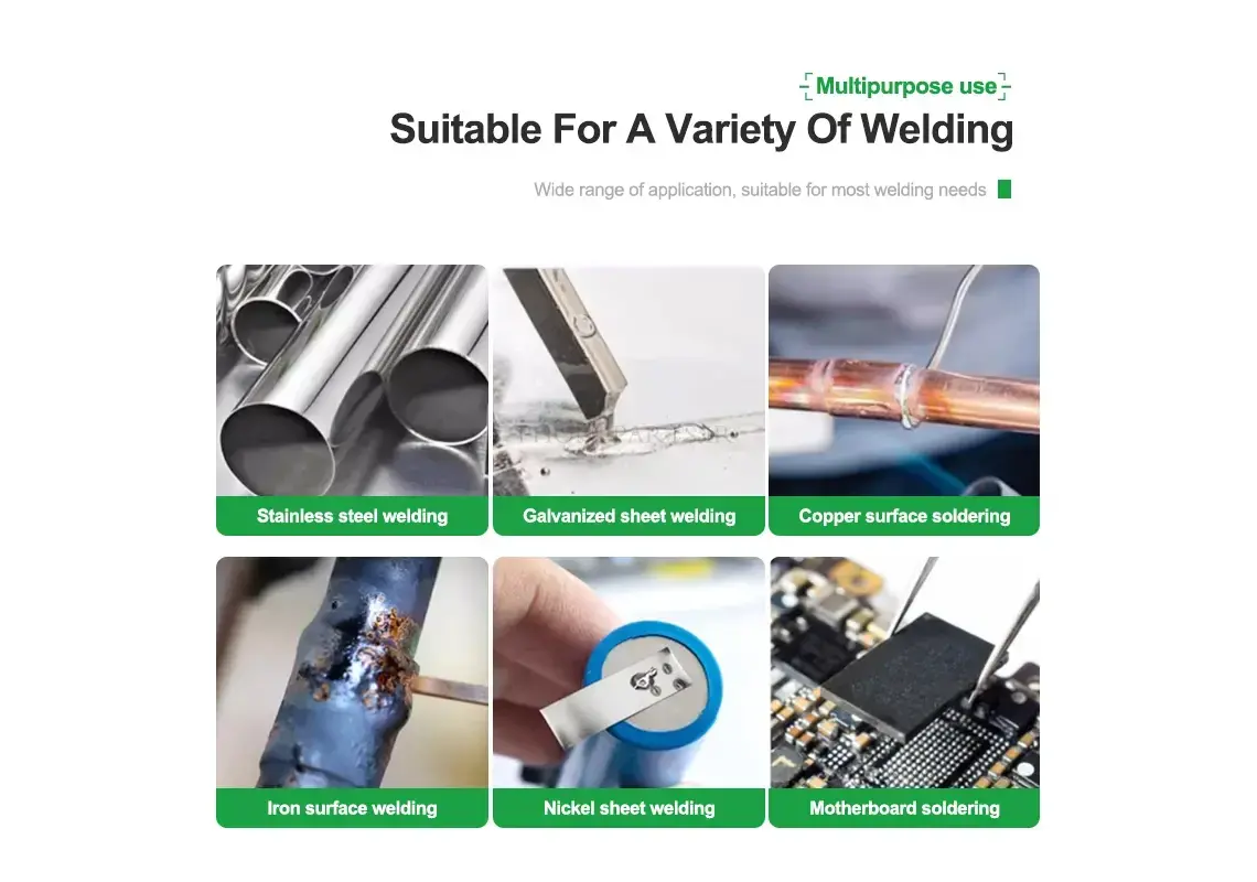 این محصول برای جوشکاری فولاد ضد زنگ، ورقهای نیکل، مس، آهن، ورقهای گالوانیزه و سایر فلزات و همچنین تعمیر نقاط اکسیداسیون مناسب است.