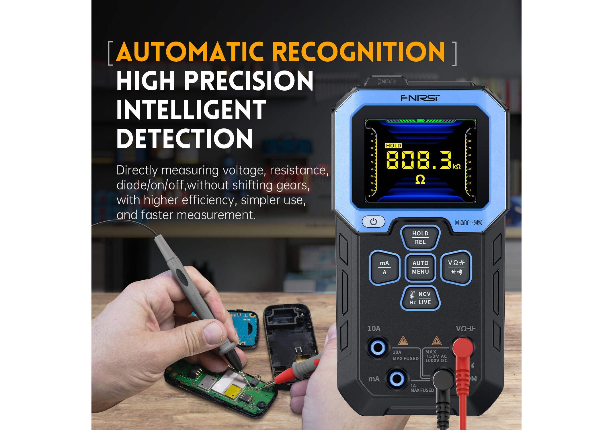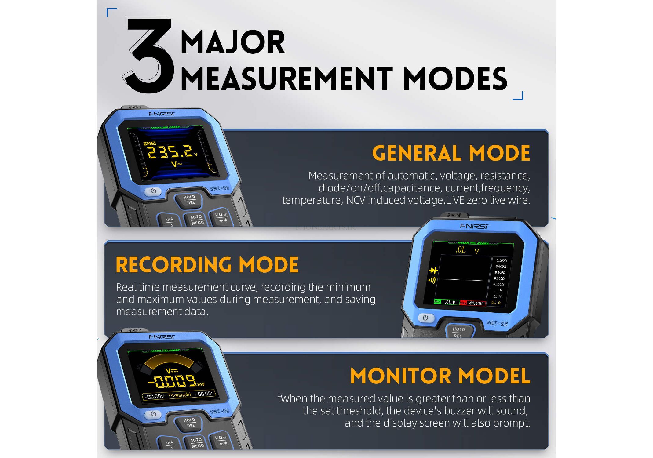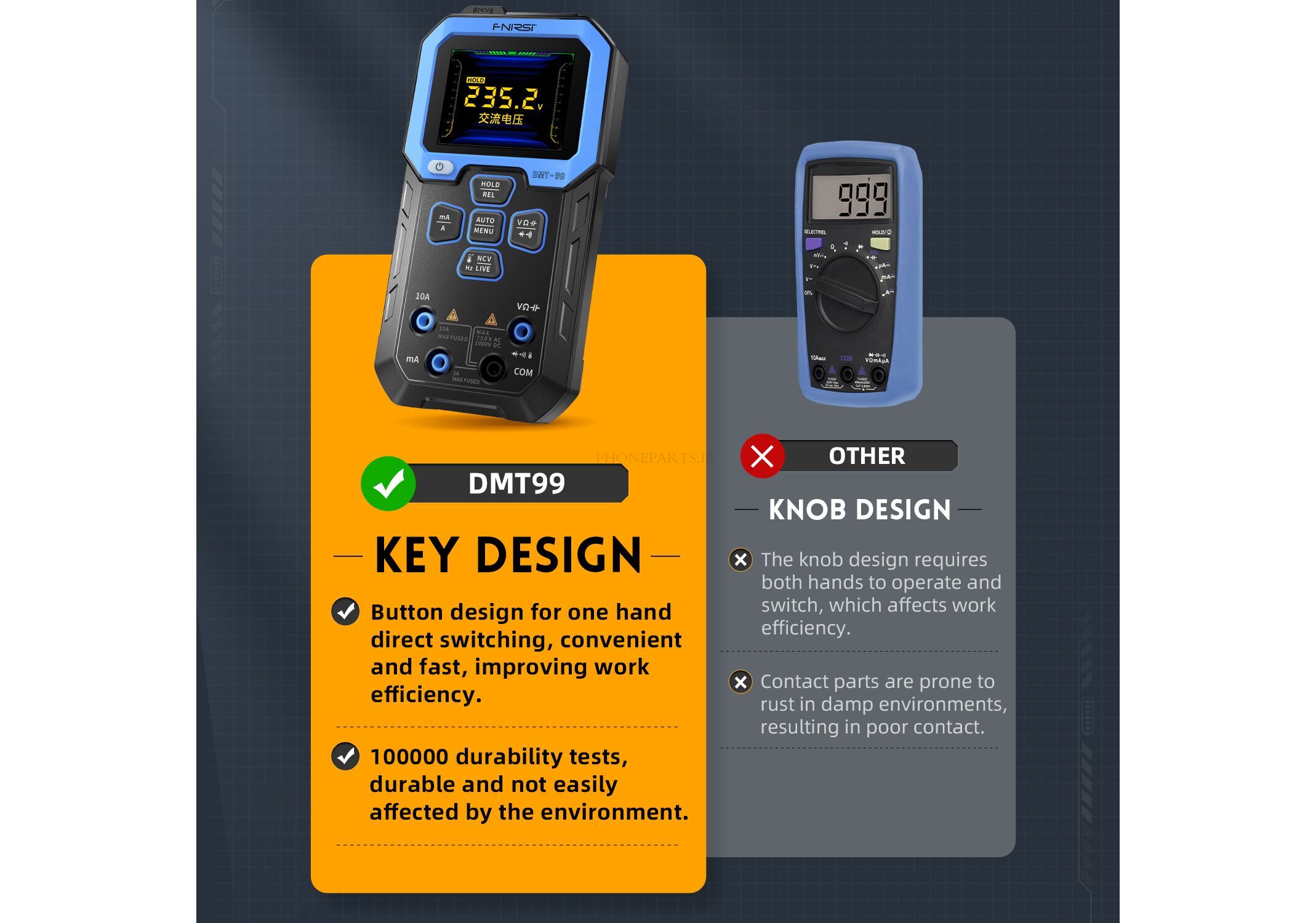 DMT-99 یکی از مولتی مترهای اتورنج – هوشمند تولید شده توسط شرکت FNIRSI میباشد. از مزایای مولتی متر FNIRSI DMT 99 میتوان به مُد های اندازه گیری، ذخیره سازی و مانیتورینگ اشاره کرد. این مولتی متر اندازه گیری را به روش True-RMS انجام میدهد و تعیین رنج به صورت اتوماتیک و هوشمند در این دستگاه صورت میگیرد.