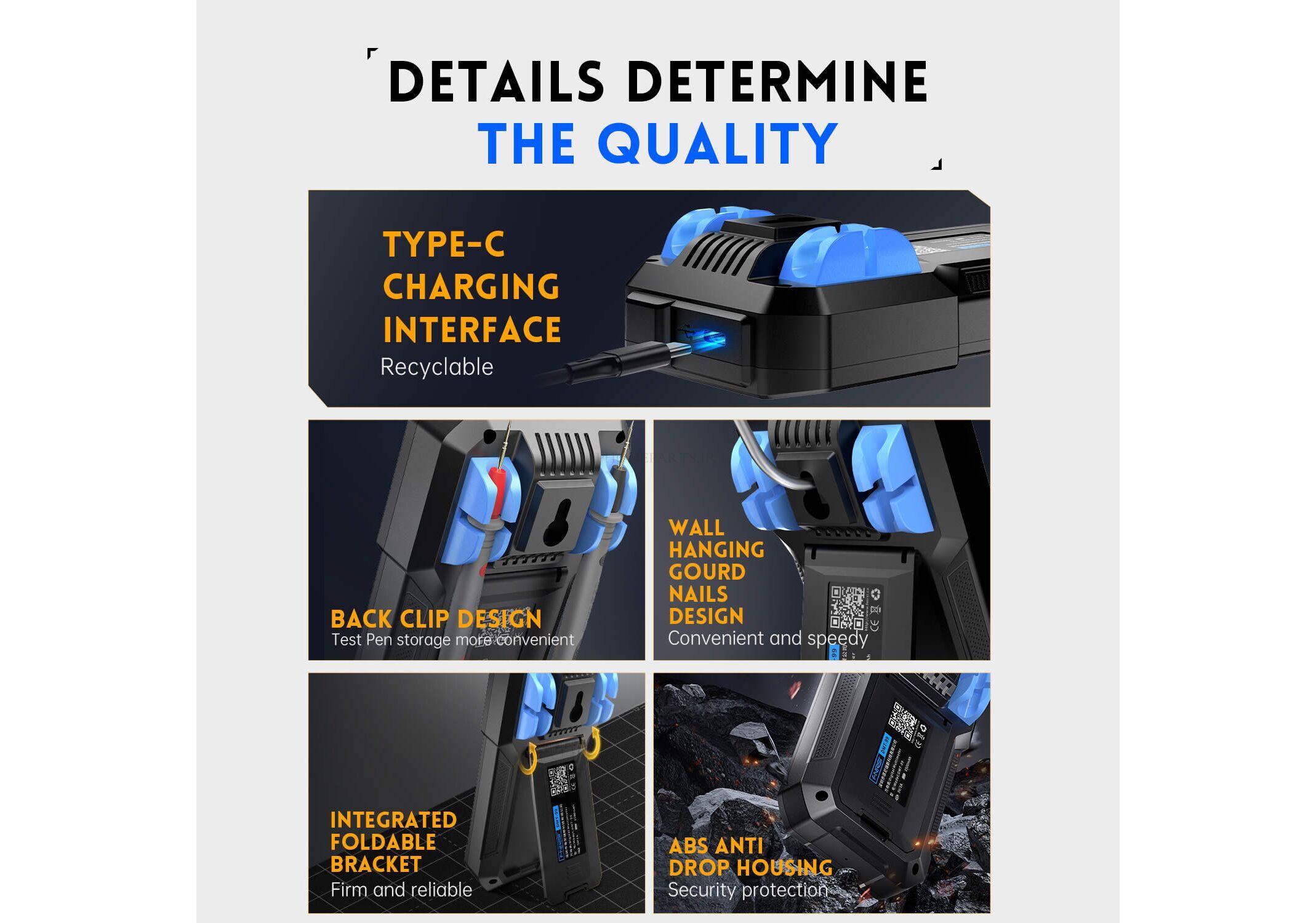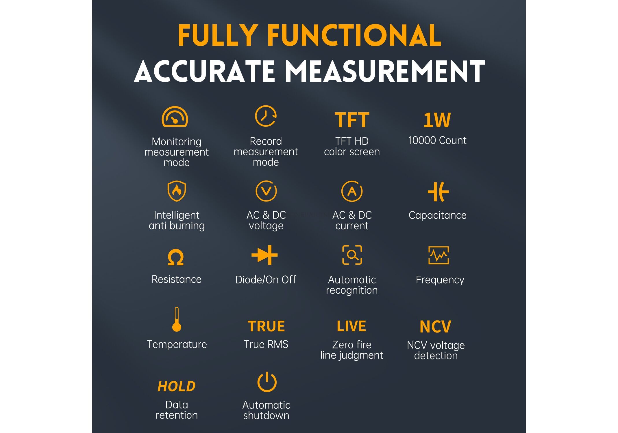اندازه گیری ولتاژها تا 750VAC و 1000VDC، جریان های الکتریکی تا 10A، اندازه گیری دما، فازمتر القائی NCV، تست Live، ظرفیت خازن، میزان مقاومت الکتریکی و فرکانس اشاره کرد. مالتی متر DMT99 یکی از کامل ترین مولتی مترها با صفحه رنگی و باتری قابل شارژ (با Type-C) به حساب می آید و میتوان گفت که تمامی پارامترهای الکترونیکی مورد نیاز را در بازه وسیعی با دقت خوبی اندازه گیری میکند. یکی دیگر از مزایای این مولتی متر، اندازه کوچک آن میباشد.