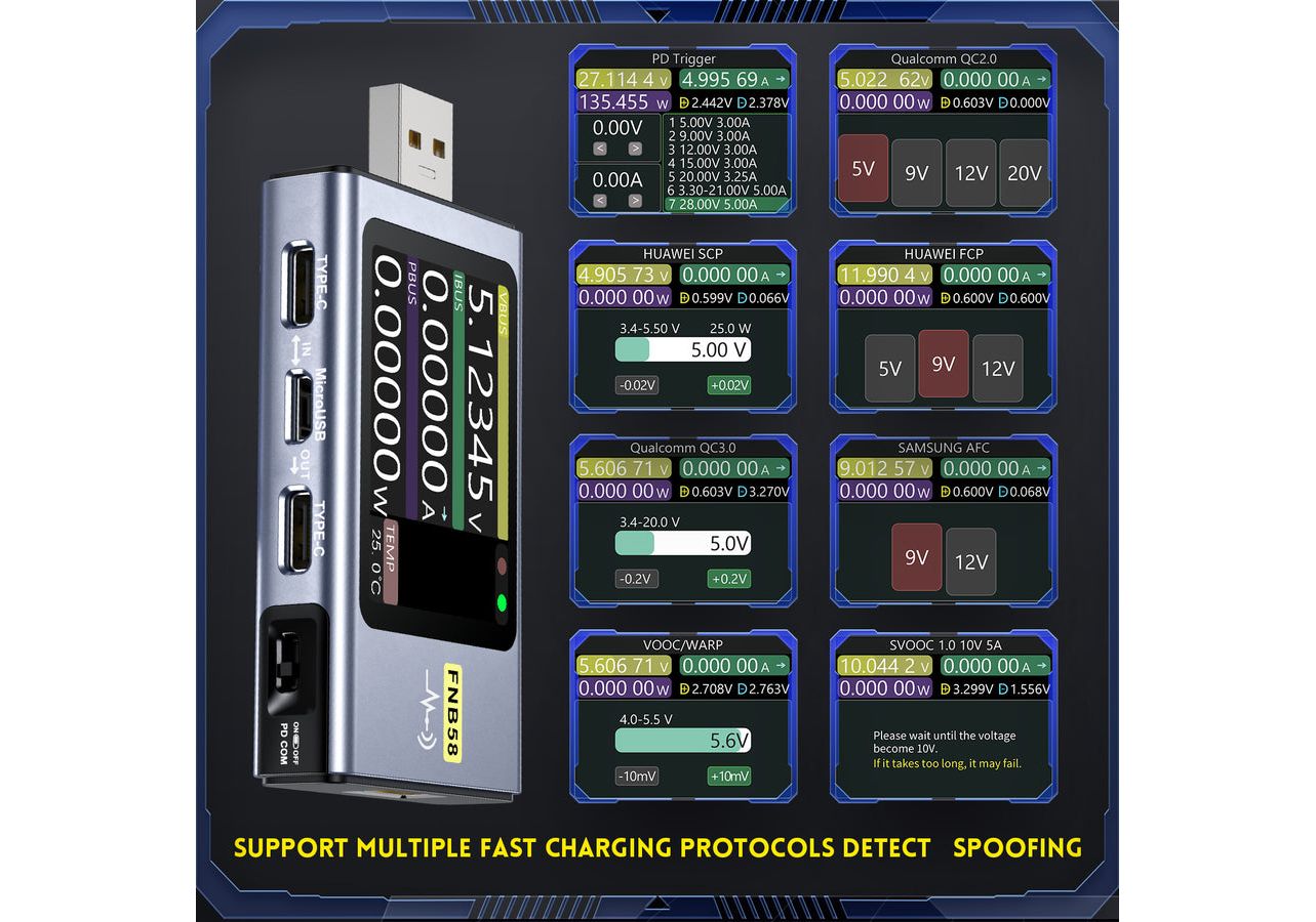- پشتیبانی از پروتکلهای شارژ سریعFNIRSI FNB58 از پروتکلهای شارژ سریع متعددی مانند QC2.0، QC3.0، PD2.0، PD3.0، VOOC/WARP، و Super VOOC پشتیبانی میکند. این دستگاه بهصورت خودکار پروتکل شارژ را شناسایی کرده و امکان فعالسازی دستی پروتکلها را نیز فراهم میکند، که برای تست عملکرد شارژرها و کابلها بسیار کاربردی است.