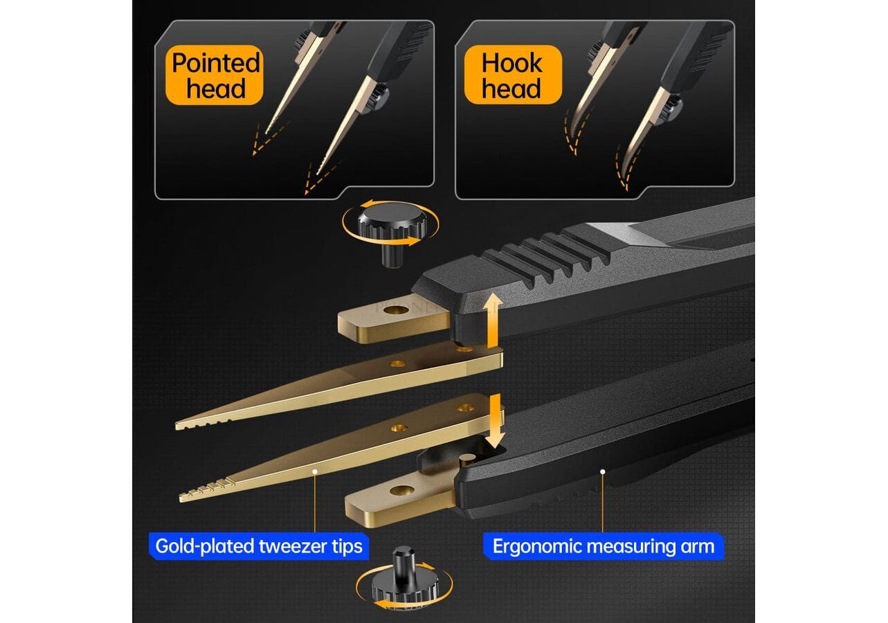 - سرهای توییزر: شامل سرهای نوکتیز و قلابی برای تست قطعات مختلف، از جمله قطعات SMD تا سایز 0403