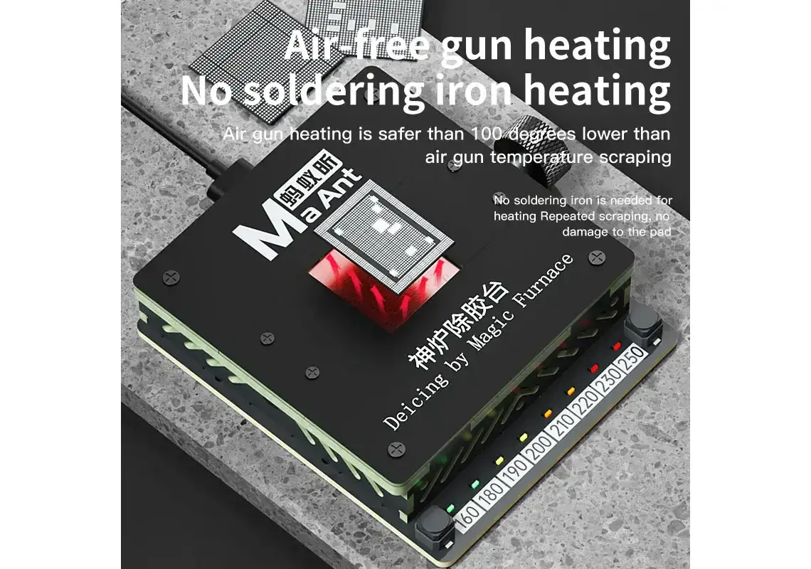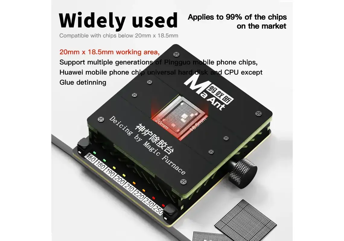 حذف چسب و قلع از چیپهای IC، CPU، NAND Flash در گوشیهای آیفون و اندروید نوع عملکرد: پیشگرمایش با دمای ثابت، بدون نیاز به هویه یا هیتر مناسب برای: بیش از ۹۹٪ چیپهای موجود در بازار با ابعاد کمتر از 20 × 18.5 میلیمتر