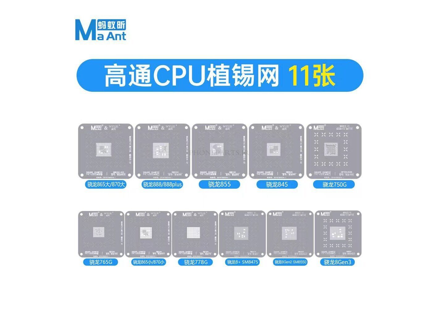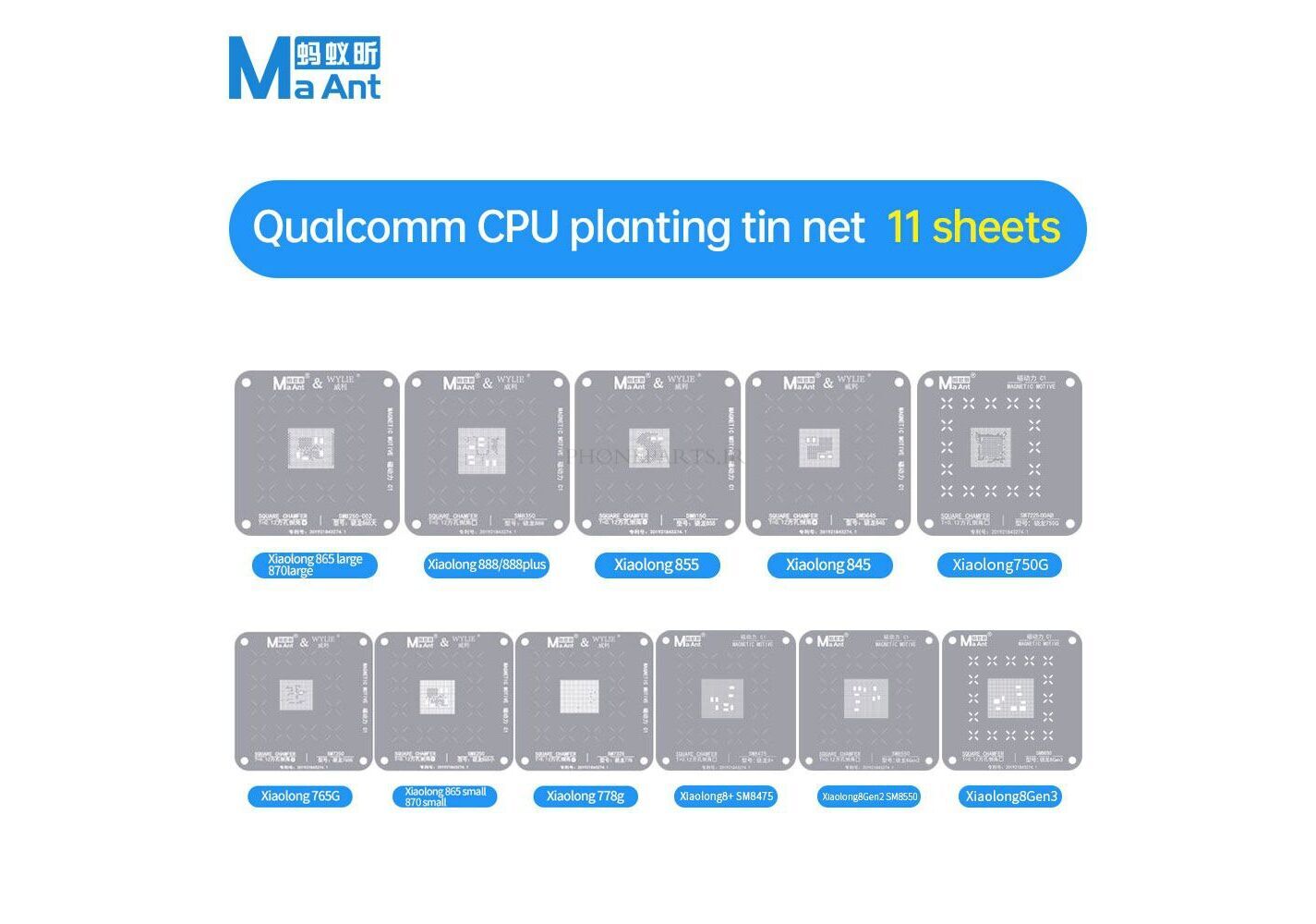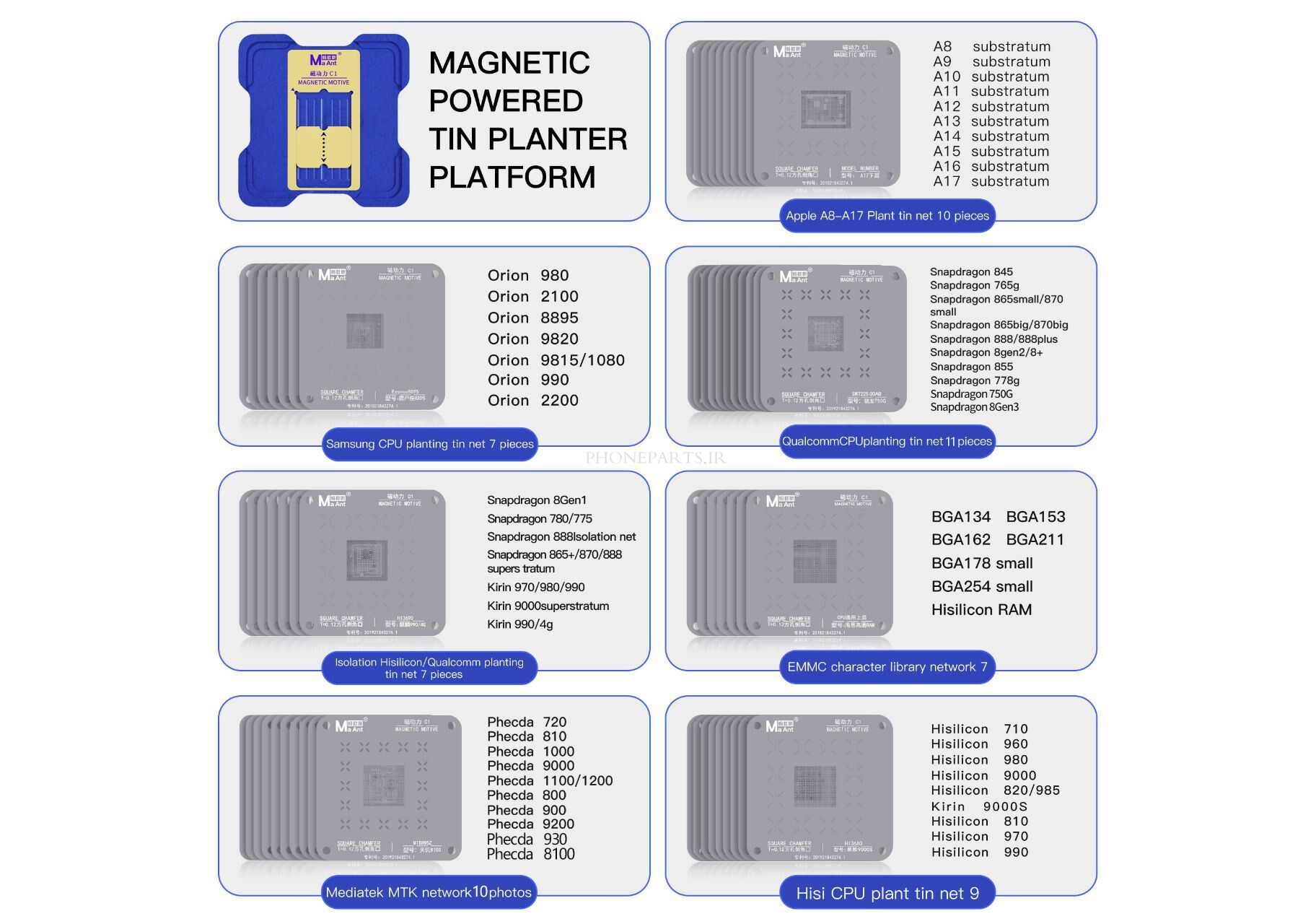 این ست شامل شابلونهای مختلف برای مدلهای آیفون از A8 تا A17 و همچنین مدلهای پرمصرف Qualcomm، Samsung، Mediatek، و Hisilicon است. این شابلونها به تعمیرکاران کمک میکنند تا عملیات لحیمکاری و تعویض قطعات را با دقت و کیفیت بالا انجام دهند.