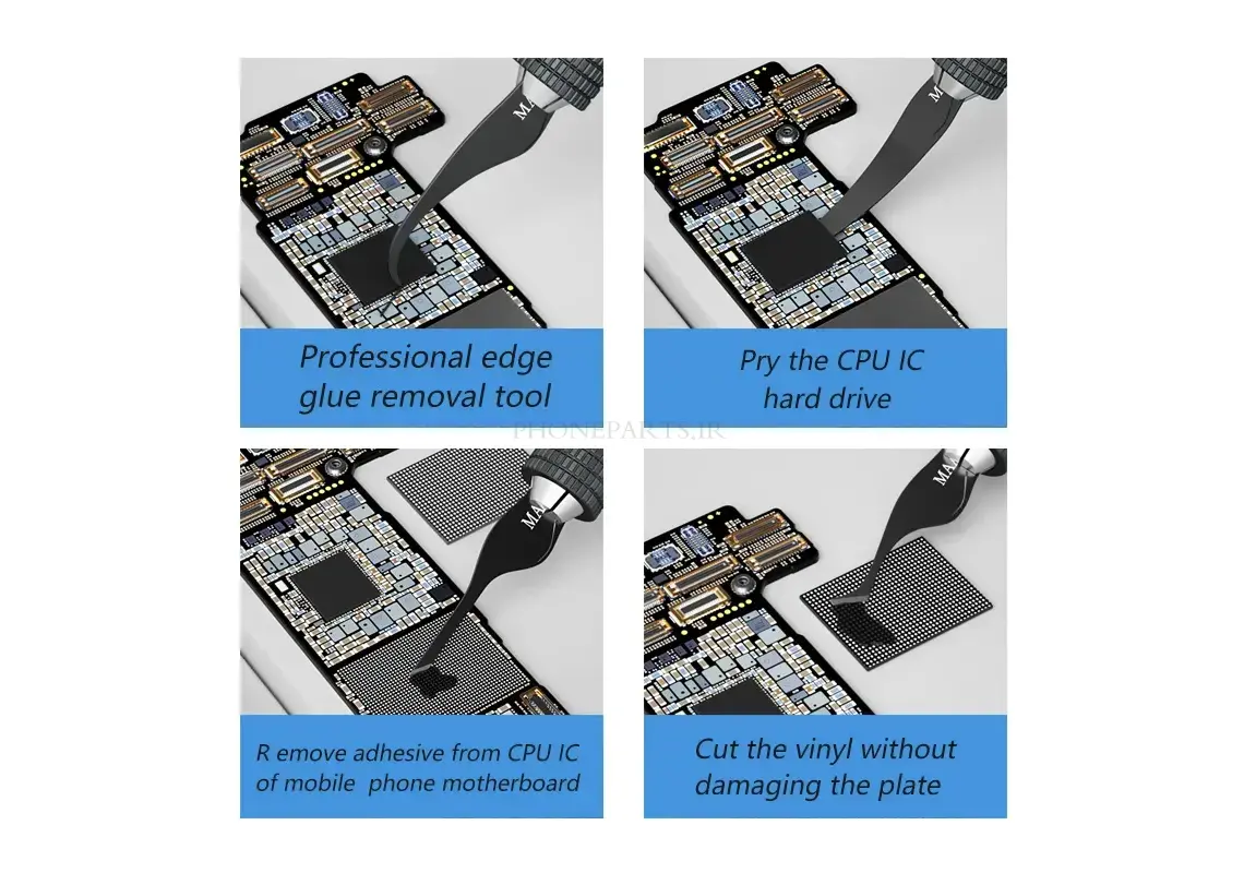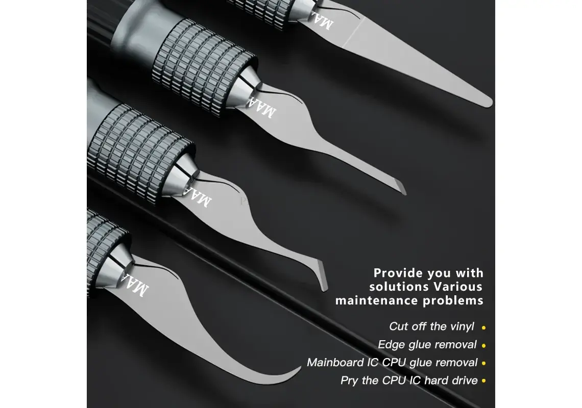 - چند منظوره بودن: MY-102 برای انجام وظایف مختلف طراحی شده است. این ابزار تنها یک کار نمیکند؛ بلکه مانند یک مشکلیاب چندکاره عمل میکند. از برش چسب سیاه مقاوم، تخلیه چسبهای کناری تا باز کردن مادربرد، این تیغهها به شما کمک میکنند.