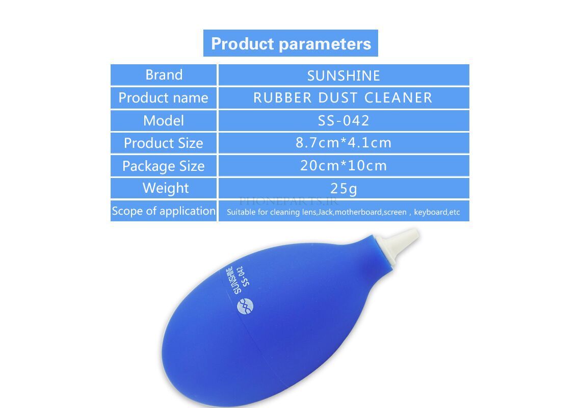 پاک کننده گرد و غبار لاستیکی Sunshine SS-042 یک ابزار کاملا سنتی برای پاک سازی گرد و غبار اطراف آیسی، لنز دوربین و مادربرد استفاده میشود و مناسب تعمیرات گوشی موبایل است.